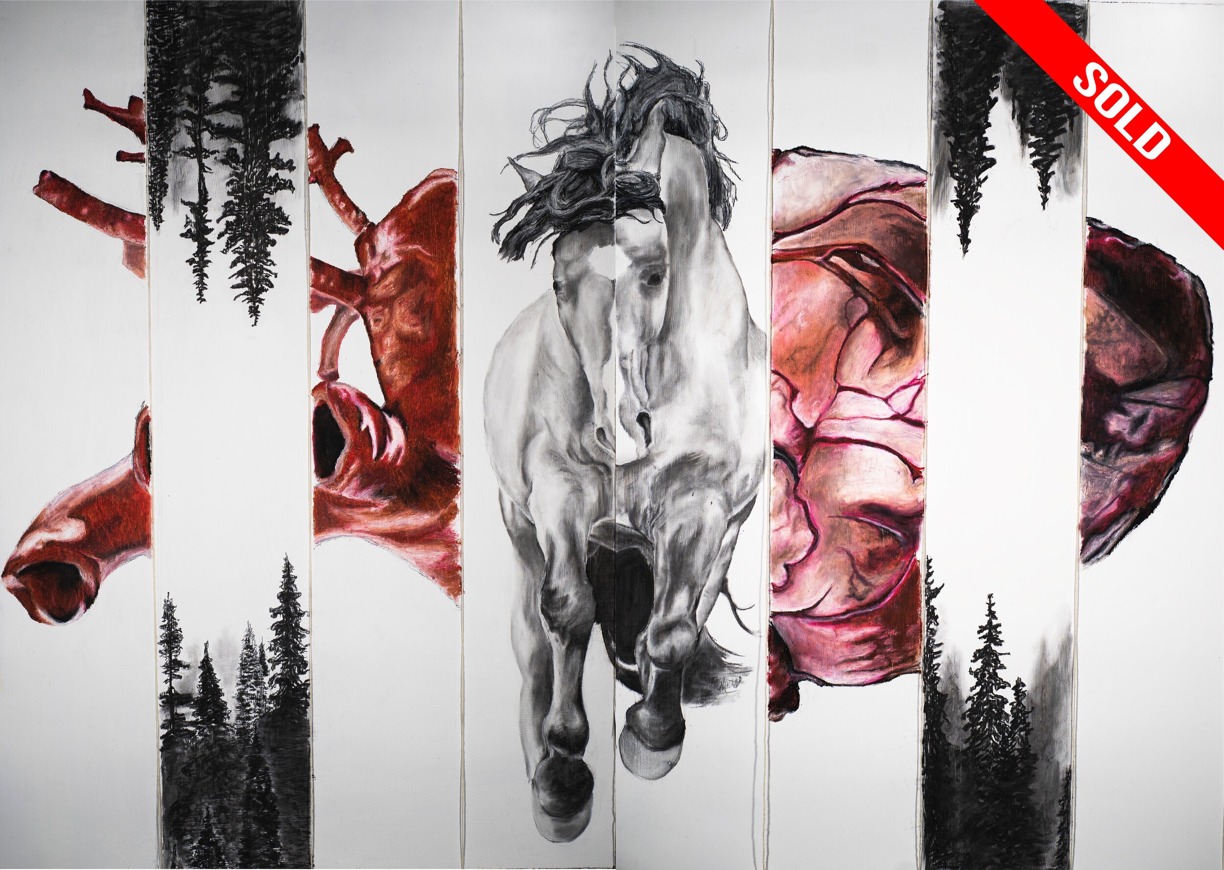 This piece is based on my exploration of wild horse populations in the United States and how they are managed by the Bureau of Land Management (BLM.) The intention is to emphasize the emotion and oftentimes distress these horses feel when they are removed from the wild and placed in holding pens which are often crowded and unnatural environments.